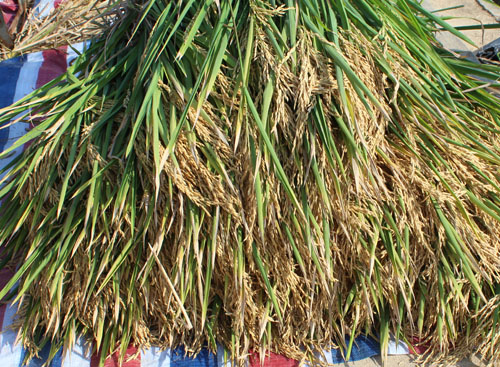 驗收小組在深08S/R1813的示范田中隨機選取了三個測產點,每個點劃定50平方米面積,現場收割,脫粒,共計收割面積150.08平方米,毛重為244.3公斤;折合成含水量13.5%的干谷,凈重為212.5公斤,換算成畝產為944公斤。
