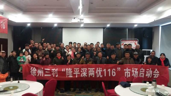 2017年的11月份,深兩優116以其連續兩年的優異表現在江蘇省的蘇北市場率先啟動。 (一) 11月6日 沭陽縣召開第一場深兩優116市場啟動會,沭陽代理商黃總在會上總結了深兩優116的十大優點: 超強分蘗 抗病性強 耐熱性好 灌漿速度快 結實率高 活棵成熟抗倒性好 收割時間彈性大 出米率高 高肥高產 安全穩產 得到了大家的高度認可,現場訂購數量喜人,會議取得了圓滿成功。 (二) 11月16日 徐州銅山縣召開了第二場深兩優116市場啟動會,此前深兩優116在徐州已有一定的市場基礎,連續兩年以其高抗倒伏,高產穩產的優秀表現獲得了大家的認可,鄉鎮代理商會上訂購熱情高漲,會后很多客戶直接到倉庫里提貨。 (三) 11月18日 宿遷市宿城區召開第三場深兩優116市場啟動會,這次會議不僅表彰了2017年度在深兩優116銷售工作中表現優秀的客戶,還頒布了2018年的市場管控規則,確保市場有序健康發展,深兩優116的品種優勢已嶄露頭角。 (四) 11月20日 睢寧縣召開第四場深兩優116啟動會,相信睢寧三利農資以其優質的銷售網絡資源與深兩優116強強聯合,必能在2018年取得優異的成績。現在,深兩優116正邁著堅定的步伐走進各鄉鎮,我們相信一個百萬斤的大品種即將出現,讓我們拭目以待! 選擇興隆 事業興隆
